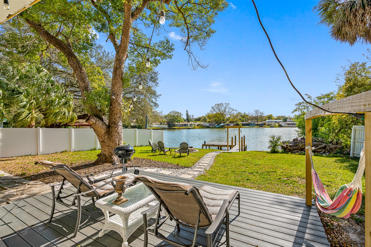 The backyard features a brand new deck with two lounge chairs, a grill, a fire pit with chairs, and a large, brand-new dock. Note that ducks do sometimes poop on the dock, although we try to clean it off as much as we can.